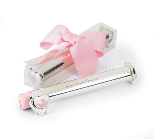 Silver plated birth certificate holder includes both a holder and personalized keepsake memento. The holder has pink enamel baby buggy logos, adorable heart end pieces and Baby's Birth Certificate engraved across the tube. The holder will arrive in an acetate box with a pink grosgrain ribbon and hangtag.